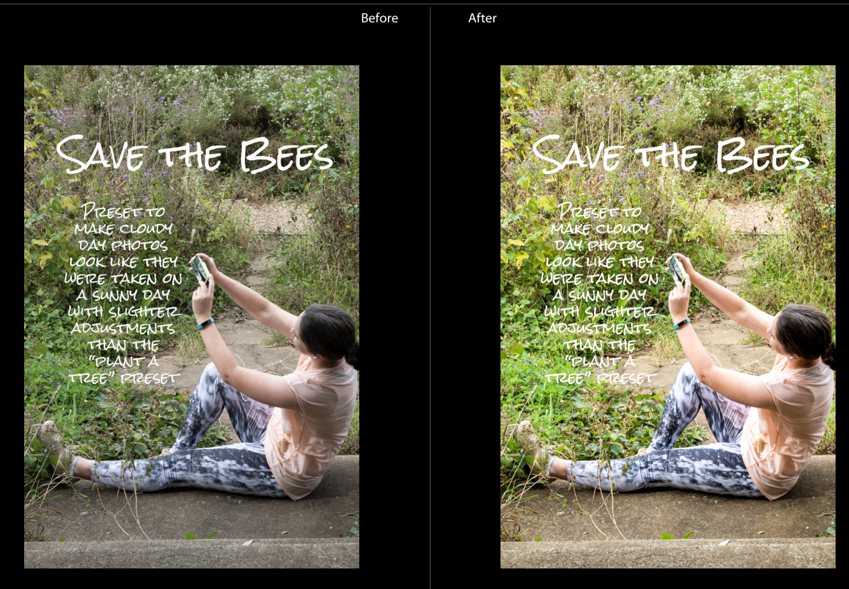 • to make cloudy day photos look like they were taken on a sunny day with slighter adjustments than the “Plant a Tree” preset